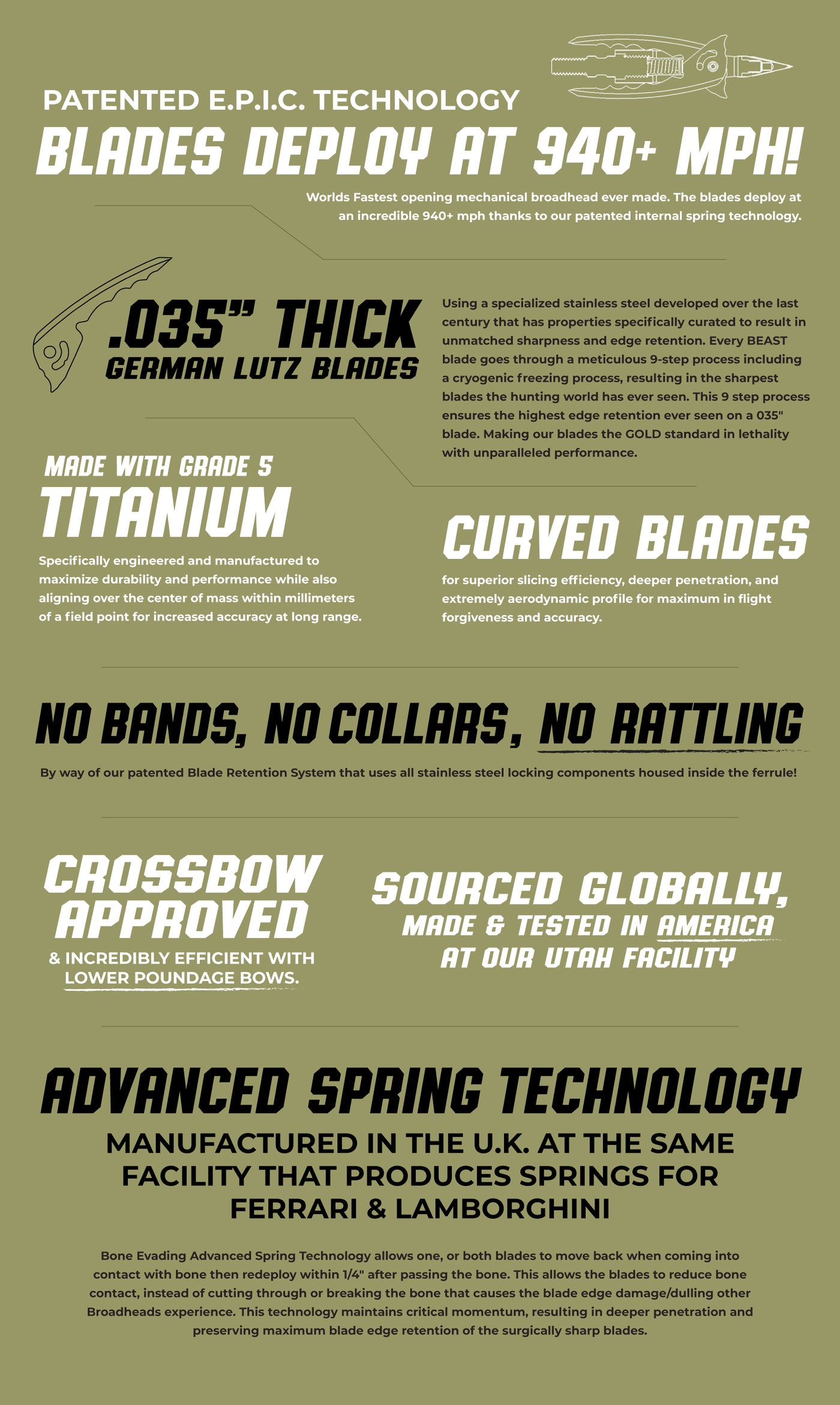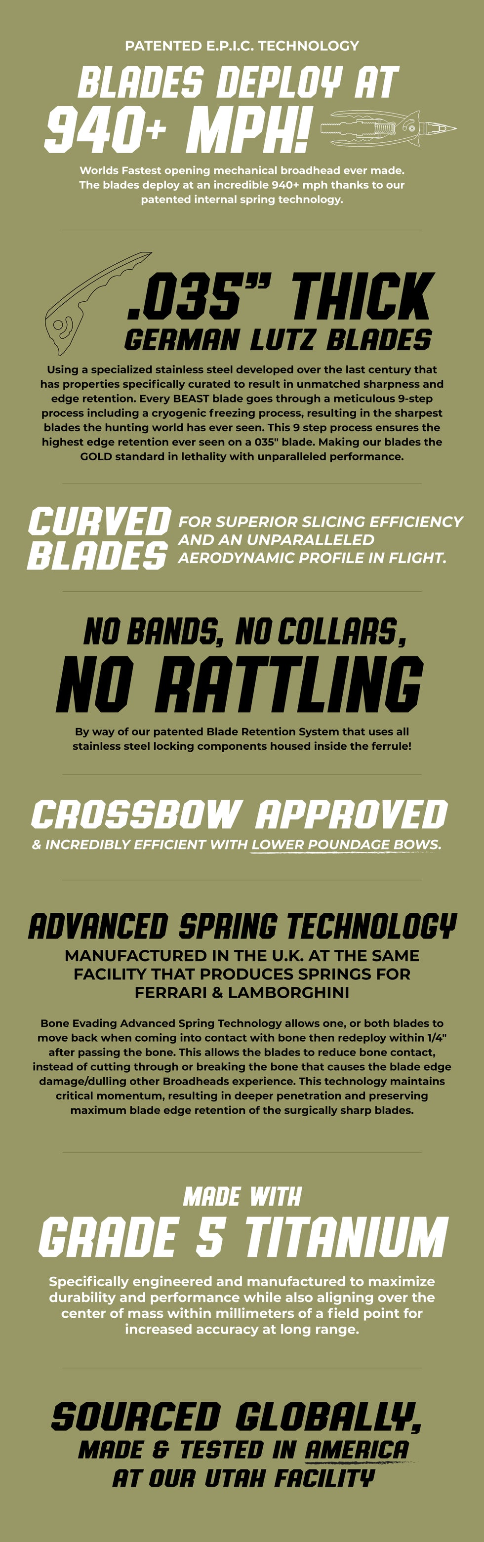 - Engineered Propulsion In Core (E.P.I.C Technology): 1.2 lbs of force on either deployment tab results in the Beast Broadhead's blades deployment at speeds over 940 mph and 22+ ft lbs of energy; ensuring devastating entry wounds and the most reliable deployment of any mechanical on the market.